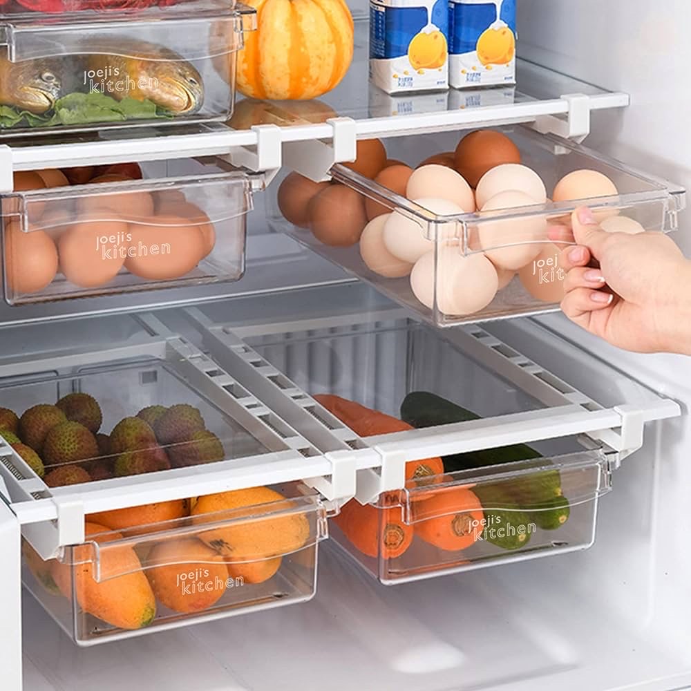🛍️Product: Joejis Set of 2 Fridge Organiser Drawer Shelf Bin - Intelligent Storage Organiser - Retractable and Adjustable Refrigerator Drawer with Handle for Easy Access (Blue & White)